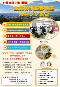 11月16日(日)に「生長の家オープン食堂」が開催されます。 この「オープン食堂」は、子どもから大人まで年齢性別問わず、ご家族の方、お一人でも、お気軽にお食事を召し上がっていただける場となっていますので、ぜひご家族のかたや友人知人もあわせてお誘い合わせの上お越しください。
